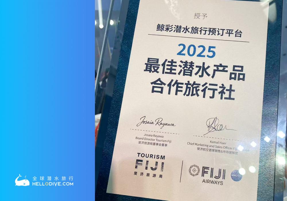 HelloDive has been recognised at the 2025 Fiji Tourism VIP Roadshow with the “Best Dive Product Travel Partner” award, presented jointly by Tourism Fiji and Fiji Airways. The recognition reflects our ongoing commitment to building high-quality, safety-focused dive travel experiences in Fiji and strengthening partnerships across the country’s key dive regions.